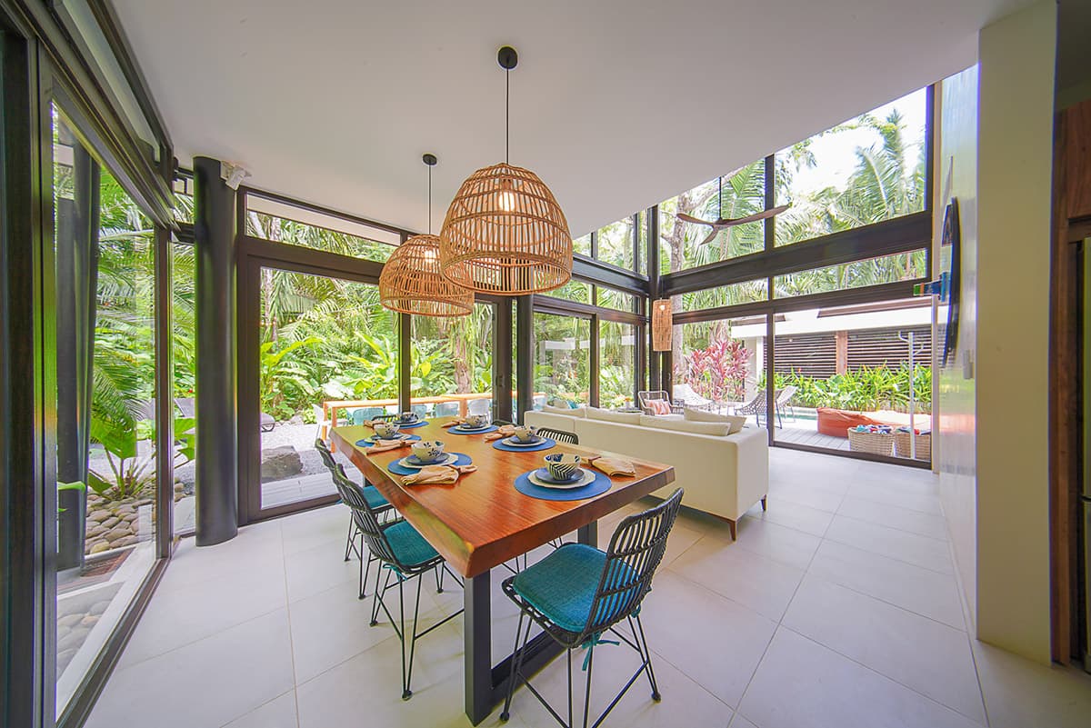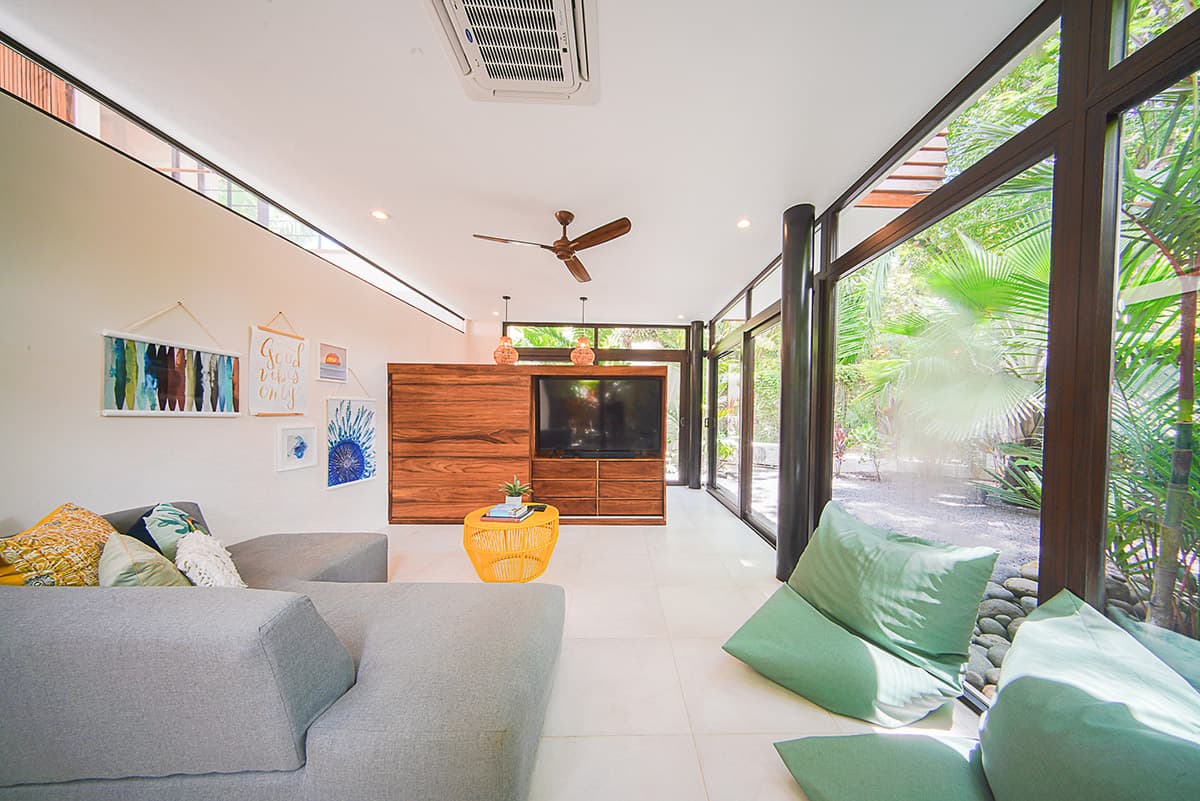 Casa Bamboo embraces eco-conscious living. Recycling, water conservation, and energy-efficient practices are encouraged. Passive cooling design, ceiling fans, and natural shade from surrounding trees. Guests are asked to turn off A/C when not in use and use DRY/ECO modes where applicable